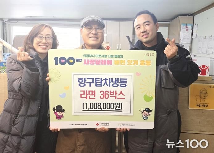 뉴스100 김동초 기자 | 의정부시 장암동주민센터는 12월 29일 항구탑차냉동이 라면 36상자(100만 원 상당)를 기부하며 ‘100일간 사랑릴레이 배턴 잇기’에 동참했다고 밝혔다.