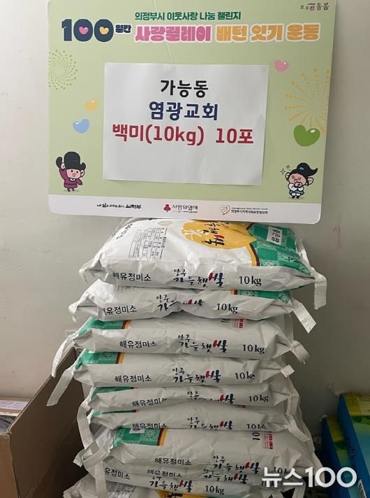 뉴스100 김동초 기자 | 의정부시 가능동주민센터는 12월 26일 의정부 염광교회가 연말을 맞아 백미 10포(10kg 단위)를 기탁하며 ‘100일간 사랑릴레이 배턴 잇기’에 동참했다고 밝혔다.