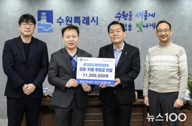뉴스100 김동초 기자 | 수원시 창업지원센터 입주기업협의회가 “학대 피해아동 지원에 사용해 달라”며 수원시에 후원금 1100만 원을 전달했다. 전달식은 30일 이재준 수원시장 집무실에서 열렸다.