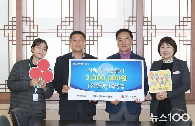 뉴스100 김동초 기자 | 평택시 서탄면에 있는 ㈜한양기술공업은 관내 취약계층 지원을 위한 성금 300만 원을 평택시청 대외협력실에서 평택행복나눔본부에 전달했다.