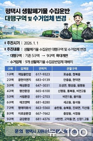 뉴스100 김동초 기자 | 평택시는 도시환경 변화와 인구증가에 따른 생활폐기물 처리 수요 증가에 대응하기 위해 생활폐기물 수집 운반 운영체계를 전면 개편한다고 밝혔다.
