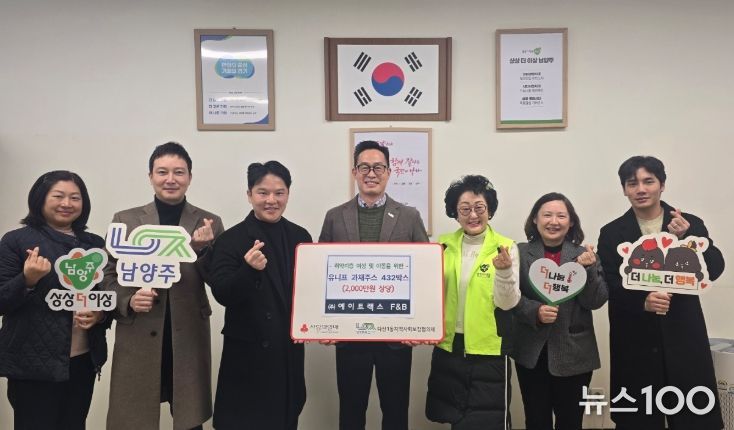 뉴스100 김동초 기자 | 남양주시는 30일 다산행정복지센터에서 ㈜에이트랙스 에프앤비가 지역 아동을 위한 과채주스 432박스를 전달했다고 밝혔다.