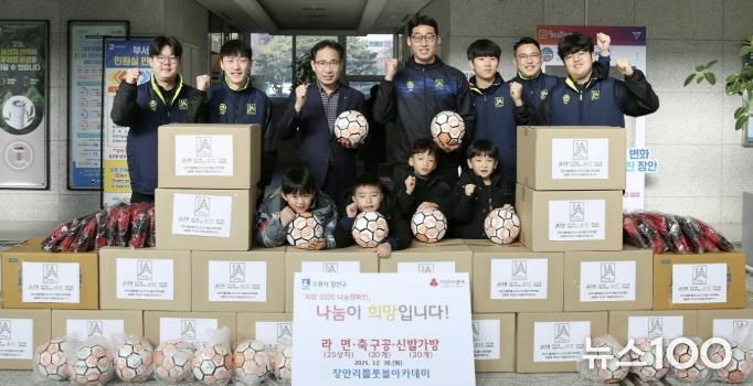 뉴스100 김동초 기자 | 수원시 장안구는 장안리틀풋볼아카데미가 지난 30일 장안구청에 라면 25상자와 축구공 20개 기부했다고 밝혔다. 이번 기부는 아카데미 회원들이 십시일반으로 정성을 모아 마련한 것으로, 장안구 관내 어려운 이웃들에게 전달될 예정이다.
