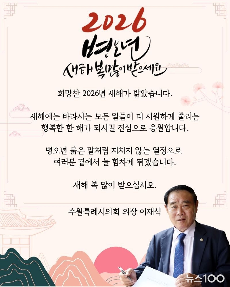 이재식 의장은 “수원특례시의회는 2026년에도‘책임지는 의정, 신뢰받는 의회’라는 시민과의 약속을 굳건히 지켜 나가겠다”며 “병오년 붉은 말의 기운처럼 뜨거운 열정과 끈기로 하나의 조례, 하나의 정책이 시민의 삶에 어떤 변화를 가져올지 끝까지 고민하며, 시민이 체감할 수 있는 실효성 있는 의정을 펼치겠다”고 새해 포부를 밝혔다.