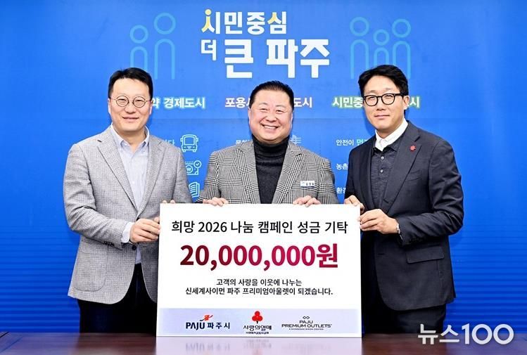 뉴스100 김동초 기자 | 파주시는 지난 31일 신세계사이먼 파주 프리미엄 아울렛으로부터 관내 저소득 취약계층 지원을 위한 성금 2,000만 원을 기탁 받았다고 밝혔다.
