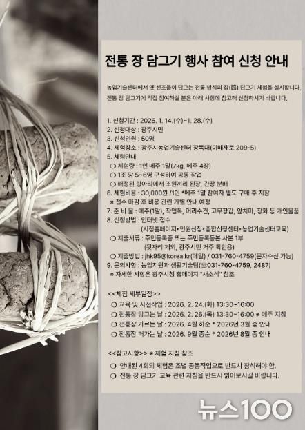 뉴스100 김동초 기자 | 광주시는 시민들에게 전통 장류의 우수성과 발효식품의 가치를 알리고 손수 장을 담가보는 체험 기회를 제공하기 위해 ‘2026년 전통 장(醬) 담그기 체험’ 참여자를 모집한다고 9일 밝혔다.