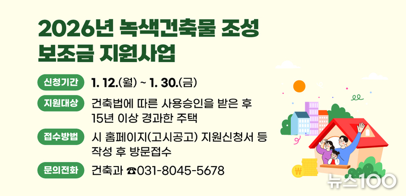 안양시(시장 최대호)는 높은 에너지 효율 달성 및 온실가스 배출 저감을 위해 노후한 건축물의 보수공사 비용을 지원하는 ‘2026년 녹색건축물 조성 보조금 지원사업’을 추진한다고 12일 밝혔다.