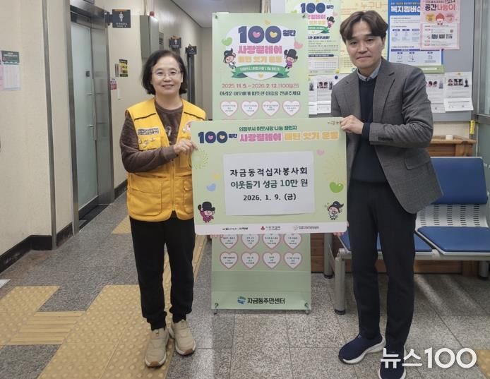 뉴스100 김동초 기자 | 의정부시 자금동주민센터는 1월 9일 대한적십자사 자금동 적십자봉사회가 ‘100일간 사랑릴레이 배턴 잇기’에 동참해 성금 10만 원을 기탁했다고 밝혔다.
