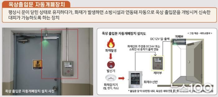 옥상 출입문 비상 자동개폐장치는 평소 문이 닫힌 상태에서 화재가 발생했을 경우 소방시설과 연동돼 자동으로 옥상 출입문을 개방해 신속한 대피를 돕는다.