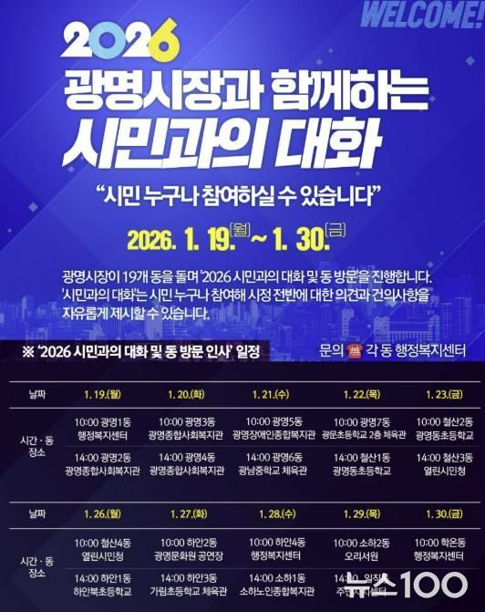광명시는 오는 19일부터 30일까지 관내 19개 동에서 순차적으로 ‘시민과의 대화’를 진행한다고 15일 밝혔다.