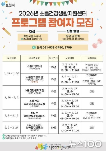 뉴스100 김동초 기자 | 포천시 소흘건강생활지원센터는 시민들의 건강 증진과 활기찬 일상 지원을 위해 오는 19일부터 ‘2026년 상반기 건강증진 프로그램’ 참여자를 모집한다.