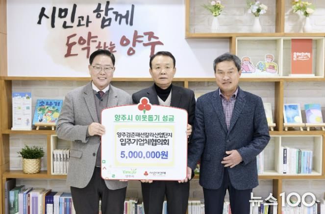 뉴스100 김동초 기자 | 양주시가 지난 15일 시장실에서 양주검준패션칼라사업협동조합을 비롯한 관련 단체 및 기업으로부터 이웃돕기 성금과 성품을 기탁받았다고 밝혔다.