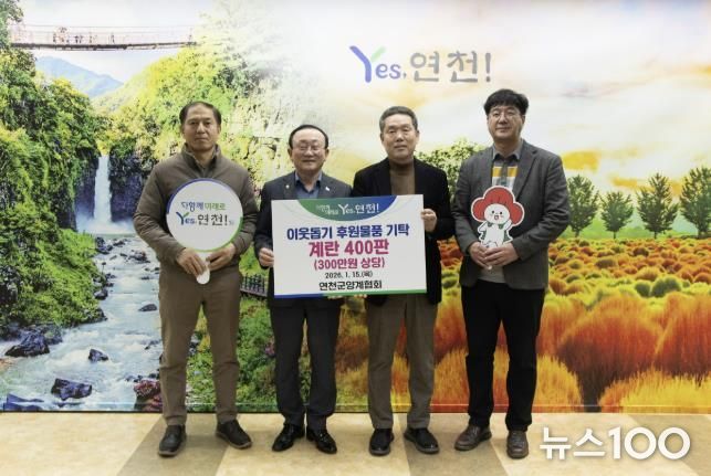 뉴스100 김동초 기자 | 연천군양계협회는 지난 15일 연천군청을 방문해 지역 내 취약가정을 지원하기 위해 계란 400판(300만원 상당)을 연천군가족센터에 후원물품으로 지정 기탁했다.