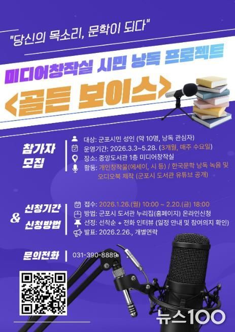 뉴스100 김동초 기자 | 군포시 중앙도서관은 시민이 직접 참여하는 낭독 콘텐츠 제작을 통해 공공 문화콘텐츠를 확산하고, 시민의 창작 경험을 지원하기 위해 미디어창작실 시민 낭독 프로젝트 '골든 보이스'를 운영한다.