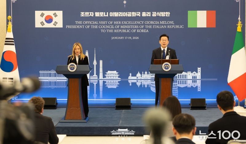 뉴스100 김동초 기자 | 이재명 대통령은 19일 조르자 멜로니 이탈리아 총리와의 정상회담 뒤 "저와 멜로니 총리는 전략적 동반자 명칭에 부합하는 미래지향적 수준으로 양국 관계를 더욱 발전시켜 나가기로 합의했다"고 밝혔다.