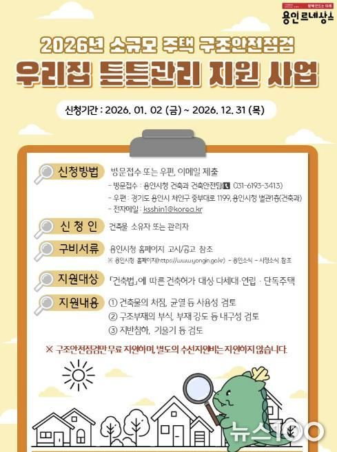 뉴스100 김동초 기자 | 용인특례시는 지역내 다세대와 연립, 단독주택 등 소규모 주택의 정밀 구조 안전점검을 무상으로 지원한다고 21일 밝혔다.