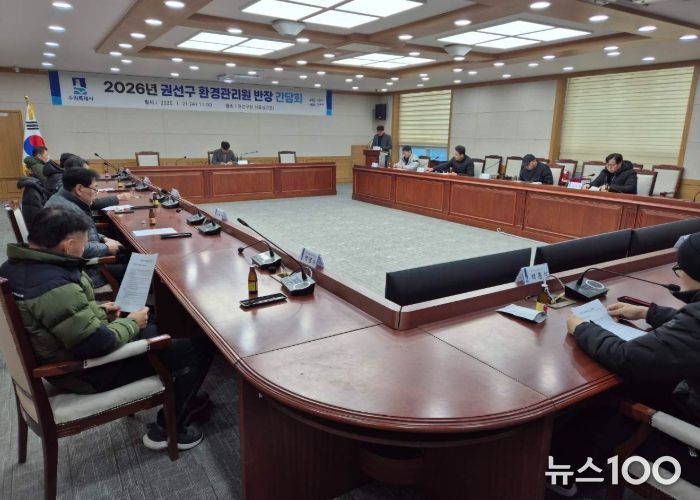 뉴스100 김동초 기자 | 권선구 환경위생과는 최일선에서 일하는 환경관리원들을 격려하고 애로사항을 청취하고자 ‘환경관리원 간담회’를 2026년 1월 21일 오전 11시에 개최했다.