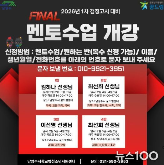 뉴스100 김동초 기자 | 남양주시는 오는 2월 3일부터 남양주시학교밖청소년지원센터에서 학업을 중단한 청소년을 대상으로 ‘2026년도 제1회 검정고시 대비 학습 멘토링 프로그램’을 운영한다고 밝혔다.