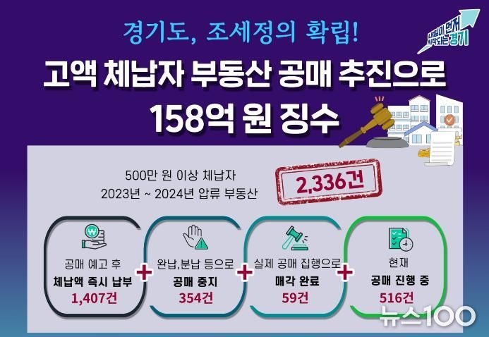뉴스100 김동초 기자 | 경기도가 2025년 3월부터 11월까지 약 9개월간 부동산 공매를 집중 추진한 결과, 지방세를 체납한 788명으로부터 총 158억 원을 징수했다고 22일 밝혔다.