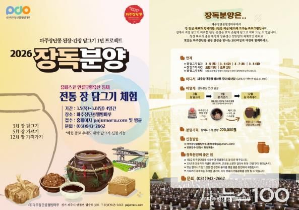 뉴스100 김동초 기자 | 파주시 출자기관인 ㈜파주장단콩웰빙마루에서는 2026 장독분양 신청자를 본격 모집한다.