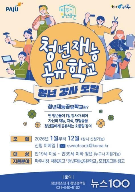 뉴스100 김동초 기자 | 파주시는 2026년 1월부터 12월까지 청년을 대상으로 '청년재능공유학교' 청년강사를 연중 상시 모집한다.