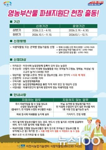 신청 대상은 농업경영체에 등록된 농업인이며, 신청 기간은 4월 10일까지이다. 신청은 이천시농업기술센터 영농기술팀 또는 식량작물팀으로 하면 된다. 현장 파쇄작업은 2월 19일부터 4월 30일까지 진행된다.