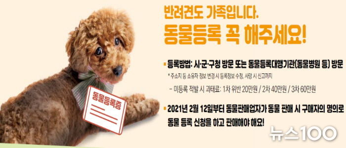‘동물보호법’ 제15조에 따라 등록대상동물의 소유자는 동물의 보호와 유실·유기 방지를 위해 주택·준주택 또는 그 외 장소에서 반려 목적으로 기르는 2개월령 이상의 개를 시장·군수·구청장 또는 특별자치시장에게 등록해야 한다. 이를 이행하지 않을 경우, 같은 법 제101조에 따라 최대 60만 원 이하의 과태료가 부과될 수 있다.