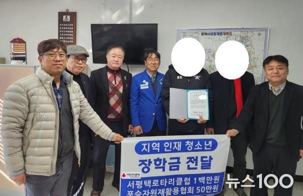 뉴스100 김동초 기자 | 평택시 포승읍을 기반으로 활동하는 단체인 서평택로타리클럽과 자원재활용협회가 지난 29일 포승읍 행정복지센터에서 지역 인재 청소년에게 장학금 100만 원(서평택로타리클럽)과 50만 원(포승자원재활용협회)을 각각 전달하는 ‘지역 인재 청소년 장학금 전달식’을 가졌다.