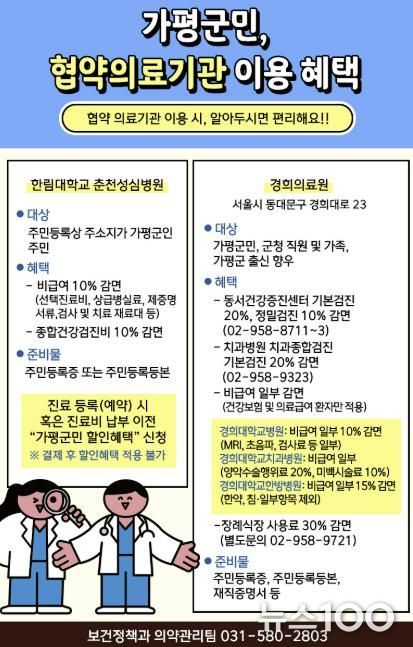 뉴스100 김동초 기자 | 가평군은 24시간 응급실과 심야약국 운영, 협약병원 감면 혜택을 다시 한번 종합적으로 안내하며 군민들의 적극적인 이용을 당부했다. 기존부터 시행중인 제도들이지만 군민들이 내용을 정확히 알지 못해 이용하지 못하는 사례를 줄이기 위해서다.
