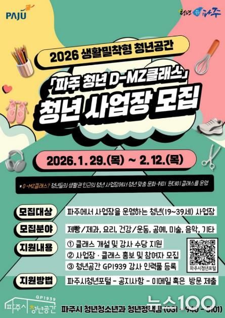 뉴스100 김동초 기자 | 파주시가 지역 청년이 운영하는 사업장을 활용해 청년 대상 문화·취미 프로그램을 운영하는 2026 생활밀착형 청년공간, ‘파주 청년 디(D)-엠지(MZ)클래스’에 참여할 청년사업장을 모집한다.