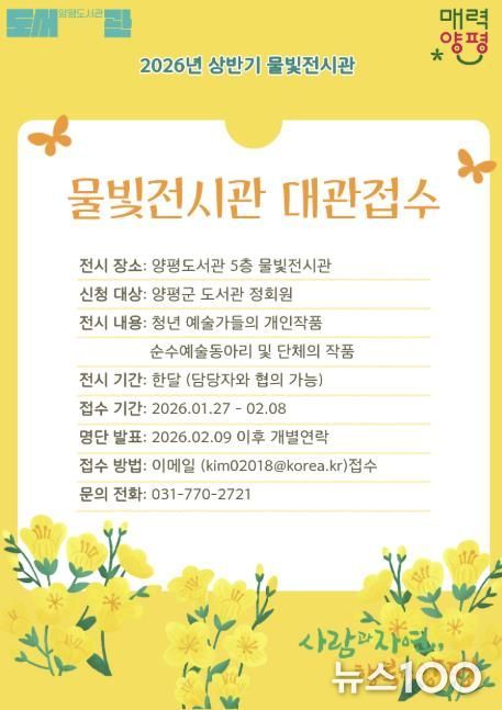 물빛전시관은 2026년 상반기 전시 대관 접수를 시작한다. 이번 대관을 통해 전시가 가능한 분야는 청년 예술가의 개인 작품과 순수예술 동아리 및 단체의 작품 전시로, 전시 기간은 팀(개인) 당 1개월이다.
