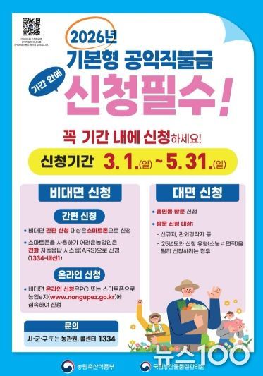 뉴스100 김동초 기자 | 양주시가 농업·농촌의 공익기능 증진과 농업인의 소득 안정을 위해 ‘2026년 기본형 공익직접지불금’을 오는 3월 1일부터 5월 31일까지 신청받는다.