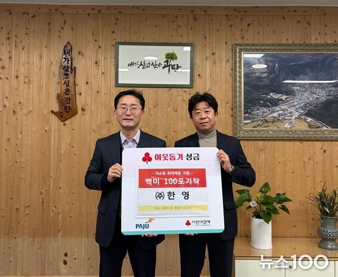 뉴스100 김동초 기자 | 파주시 광탄면은 지난 3일 광탄면에 소재한 ㈜한영으로부터 300만 원 상당의 백미 100포를 전달받았다고 전했다.