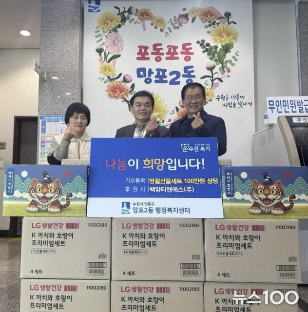 뉴스100 김동초 기자 | 영통구 망포2동 행정복지센터는 지난 3일 백양티앤에스(주)가 설 명절을 맞아 100만 원 상당의 명절 선물세트를 망포2동 취약계층을 위해 기탁했다고 밝혔다.