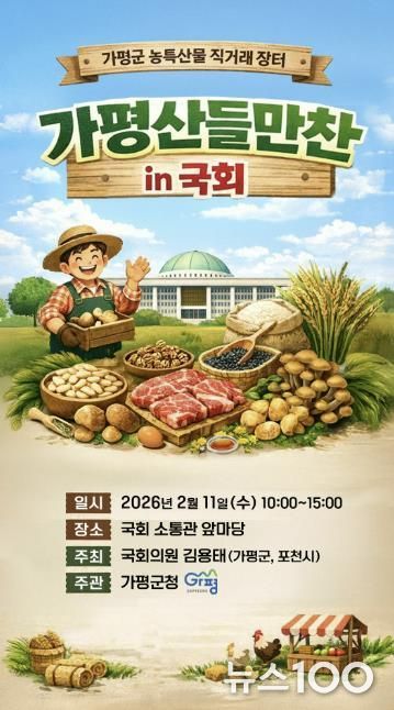 뉴스100 김동초 기자 | 설 명절을 앞두고 가평군의 우수 농특산물을 한자리에서 만날 수 있는 직거래 장터가 국회에서 열린다. 소비자와 생산자를 직접 연결하는 이번 행사는 도시민들에게 가평 농산물의 우수성과 가평의 관광자원까지 함께 알리는 자리가 될 전망이다.