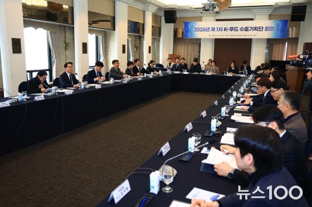 뉴스100 김동초 기자 | 농림축산식품부는 2월 4일 오전, 서울 한국프레스센터에서 2026년 제1차 ‘K-푸드 수출기획단’ 회의를 개최했다. 수출기획단은 지난해 글로벌 K-푸드 비전 선포식(12.23)에서 발족된 민·관 협의체로 이날 회의에는 관계부처 및 유관기관 각 7명, 수출·콘텐츠·물류 업계 민간위원을 포함하여 총 29명이 참석했다.