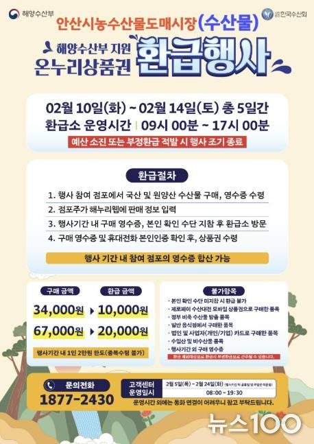 뉴스100 김동초 기자 | 안산시는 설 명절을 맞아 국산 수산물 소비 촉진과 도매시장 활성화를 위해 오는 10일부터 14일까지 5일간 ‘2026년 설 온누리상품권 환급행사’를 개최한다고 5일 밝혔다.
