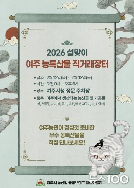 뉴스100 김동초 기자 | 여주시는 설 명절을 맞아 지역 농업인의 판로를 확대하고 시민들의 장바구니 부담을 줄이기 위해 오는 2월 12일부터 13일까지 이틀간 ‘2026 설맞이 여주 농특산물 직거래장터’를 개최한다.