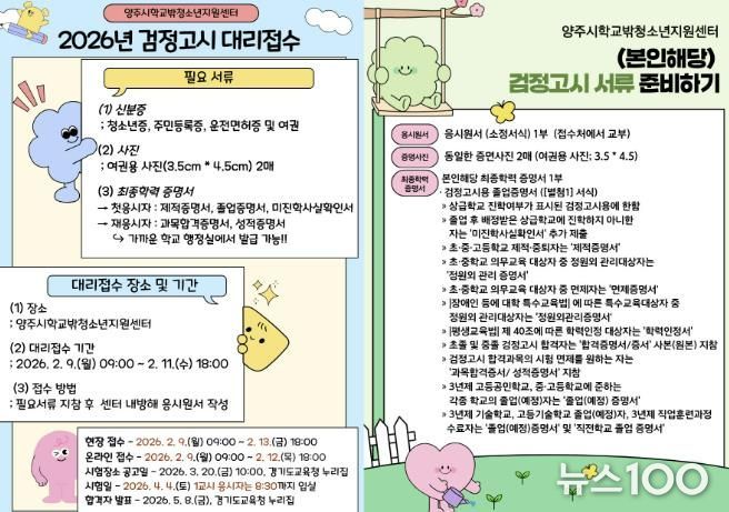 뉴스100 김동초 기자 | 양주시학교밖청소년지원센터에서는 학교 밖 청소년들을 위해 2026년 제1회 초중고 졸업 학력 검정고시 응시 원서 접수 대행을 지원한다.