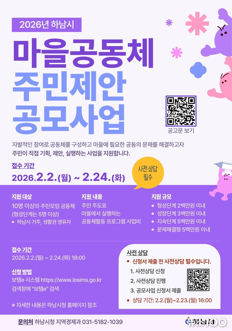 하남시(시장 이현재)는 오는 2월 24일까지 ‘2026년 하남시 마을공동체 주민제안 공모사업’에 참여할 주민모임 공동체를 모집한다.