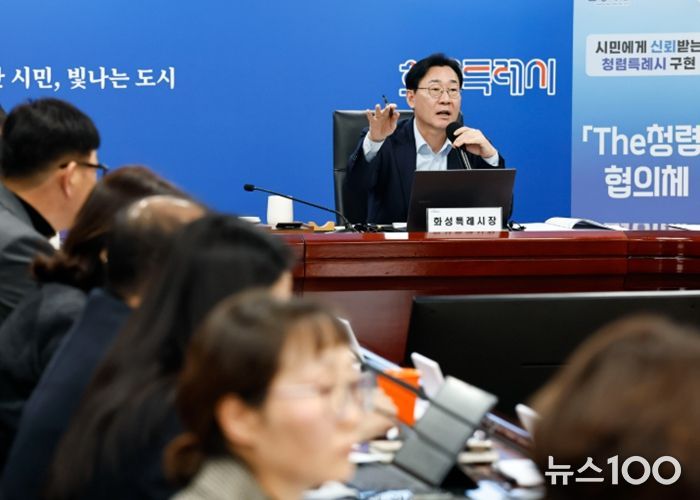 뉴스100 김동초 기자 | 화성특례시는 9일 시청 상황실에서 정명근 시장을 단장으로 실국장단 및 구청장 등 4급 이상 고위직 공무원으로 구성된 '더 청렴' 협의체 회의를 개최했다.