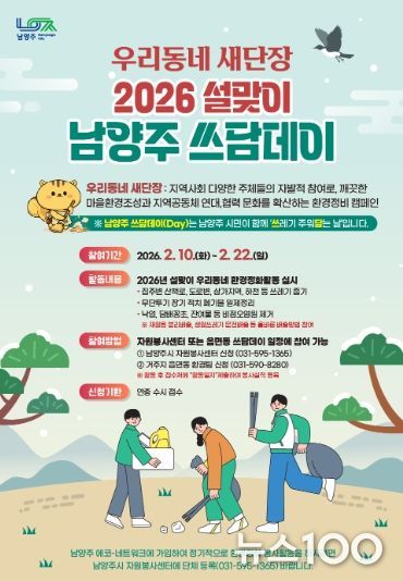 뉴스100 김동초 기자 | 남양주시는 10일부터 22일까지 시 전역에서 ‘설맞이 우리동네 새단장 남양주 쓰담데이 집중 추진기간’을 운영한다고 밝혔다.