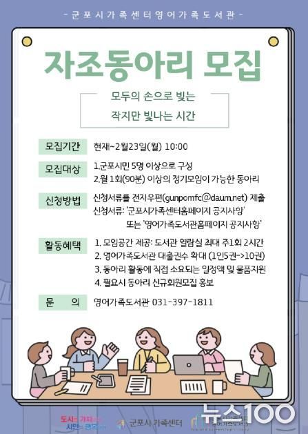 뉴스100 김동초 기자 | 군포시가족센터 영어가족도서관(관장 박성희)에서 2026년 자조동아리를 모집한다.