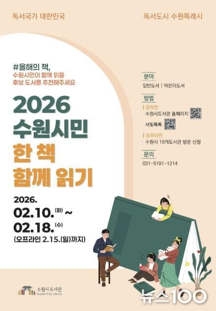 뉴스100 김동초 기자 | 수원시도서관이 ‘2026 수원시민 한 책 함께 읽기’ 올해의 책 후보 도서를 2월 18일까지 추천받는다. 수원시민 누구나 추천할 수 있다.