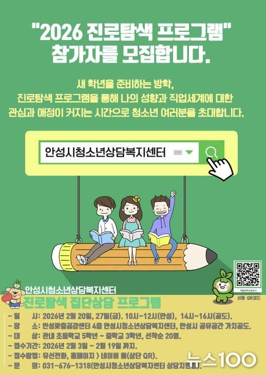 뉴스100 김동초 기자 | 안성시청소년상담복지센터는 오는 2월 20일과 27일, 2일간 청소년을 대상으로 ‘겨울방학 프로그램 – 진로탐색’을 운영한다고 밝혔다.