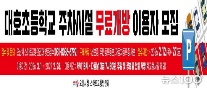 뉴스100 김동초 기자 | 오산시는 오는 2월 12일부터 27일까지 ‘대호초등학교 주차시설 무료개방’ 사업의 2년 차 이용자를 모집한다고 밝혔다.