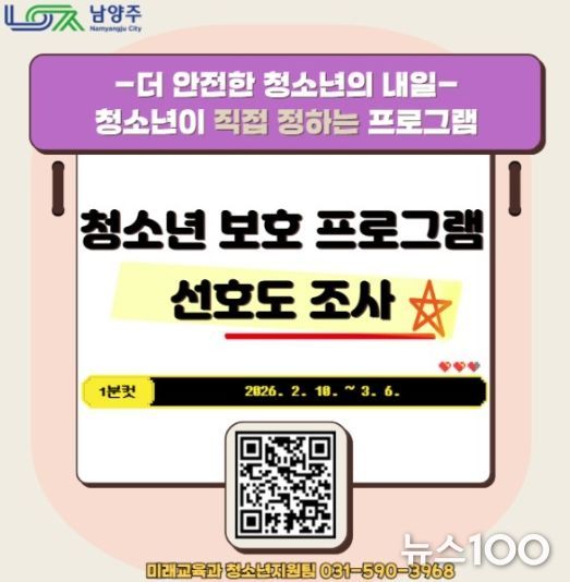 뉴스100 김동초 기자 | 남양주시는 관내 청소년들의 안전과 권익을 보호하고, 수요에 기반한 실효성 있는 정책을 수립하기 위해 ‘청소년 보호 프로그램 선호도 조사’를 실시한다고 11일 밝혔다.