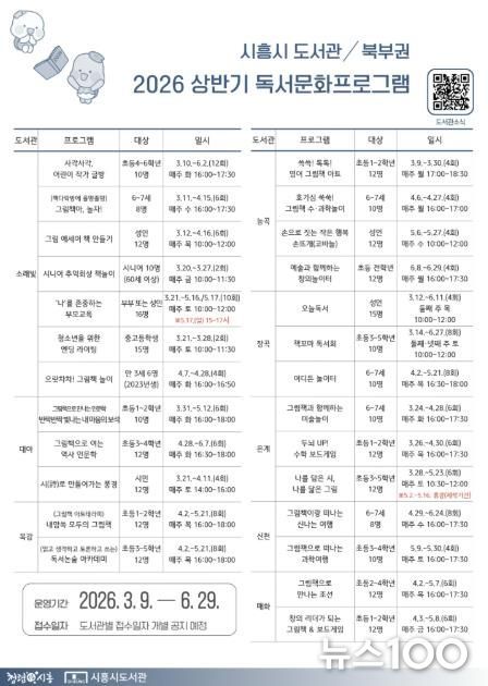 뉴스100 김동초 기자 | 시흥시 북부권 8개 공공도서관(소래빛ㆍ대야ㆍ목감ㆍ능곡ㆍ장곡ㆍ은계ㆍ신천ㆍ매화)은 오는 3월부터 6월까지 상반기 독서문화 프로그램 26개를 운영하고, 시민 292명을 대상으로 다양한 독서·문화 체험 기회를 제공한다.
