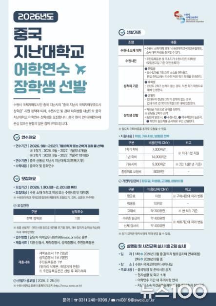 뉴스100 김동초 기자 | 수원특례시는 2월 20일까지 ‘2026년도 지난대학교 어학연수 장학생 프로그램’ 참가자 1명을 모집한다.