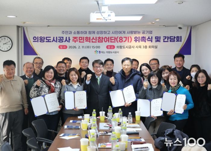 뉴스100 김동초 기자 | 의왕도시공사가 지역주민과 고객들의 경영 참여 확대와 소통 강화를 위해 2월 11일 본사 3층 회의실에서 「2026년 주민혁신참여단 8기 위촉식 및 간담회」를 개최했다.